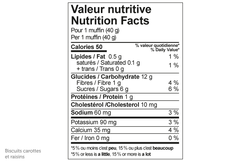 Carottes, raisins secs, farine de blé entier, farine, margarine d'huile de canla non hydrogènée (huile de palme et palmiste modifiée, protéine de soya), oeuf entier liquide, sucre, essnece artificielle, bicarbonate de sodium,poudre à pâte.